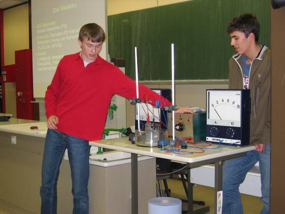 Vom Blei- bis zum Lithium-Ionen-Polymer-Akku brachten sie, untermauert durch Demon- strationsexperimente, Interessantes von der elektrochemischen Theorie über die Funktions-weise bis zu ganz praktischen Hinweisen zu Nutzung und Pflege.