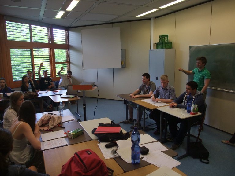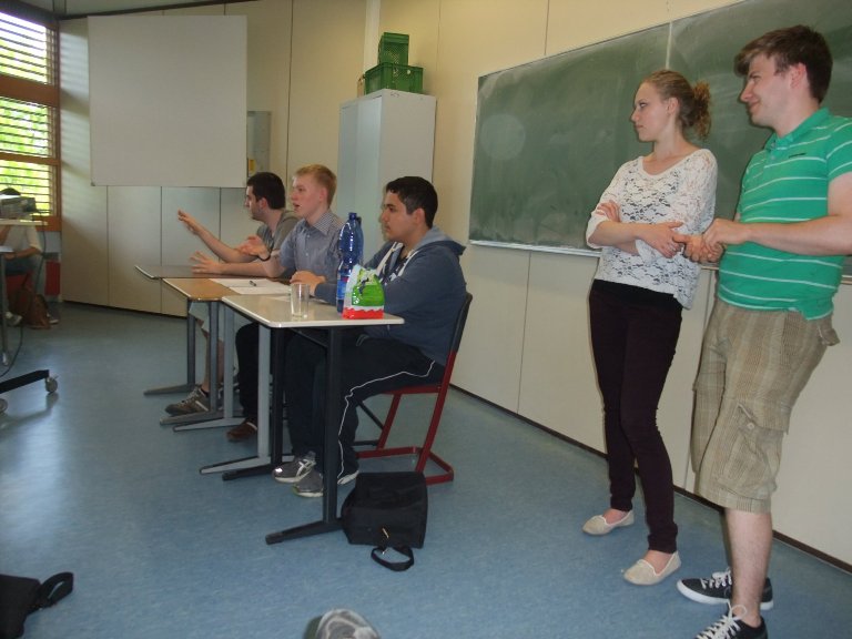 Die beiden Referenten Charlotte Schulz-Knappe und Lukas Pollmann von der Bundeszentrale für politische Bildung eröffneten den 4. Workshop mit einem Vortrag über die Ursachen und den Verlauf der Schuldenkrise. Dieser Vortrag gab den Schülerinnen und Schülern den Impuls für ein anschließendes Planspiel zum Thema „Haushaltskürzungen - ja oder nein?“. Spielerisch konnten die Teilnehmer aktiv in die Rolle der Regierung und diverser Lobbygruppen eines verschuldeten Staates schlüpfen. Das Ergebnis war eine gut strukturierte Diskussion, in der beide gegenüberstehende Parteien zu diesem Thema ihre Argumente überzeugend austauschen konnten.