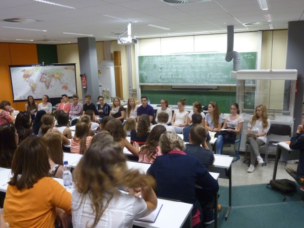 Der Einladung zu diesem Abend in der 3.Woche des neuen Schuljahres waren mehr als einhundert interessierte Eltern und Schüler der Stufen 8+ 9 gefolgt, und der Große Hörsaal der AES war rasch bis auf den letzten Platz belegt. 15 auslandserprobte und hoch motivierte „Experten" aus der Oberstufe gingen reihum auf die vielfältigen Fragen aus dem Publikum ein und über 90 spannende Minuten entwickelte sich ein intensiver, durch sehr persönliche Schilderungen berührender Gedankenaustausch zu allen wesentlichen Fragen eines Schulaufenthalts im Ausland.