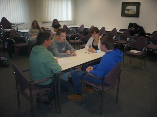 17 so genannte "5er-Betreuer/innen", also solche Schüler/innen aus den 9. Klassen, die sich seit August ein Jahr lang jeweils zu dritt intensiv um eine neue 5. Klasse kümmern und diesen als "Pat/inn/en" bei Fragen und Problemen zur Seite stehen, beendeten am 08. Februar mit einem Tagesseminar "Techniken der Streitschlichtung" ihre Ausbildung zu Schüler-Mediator/innen.
