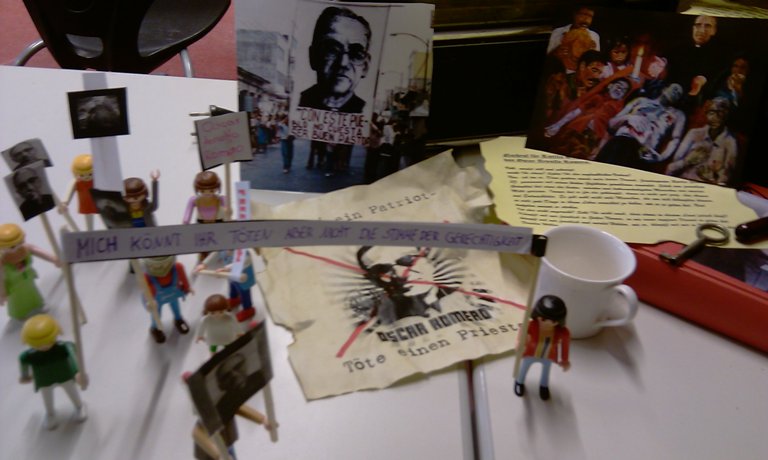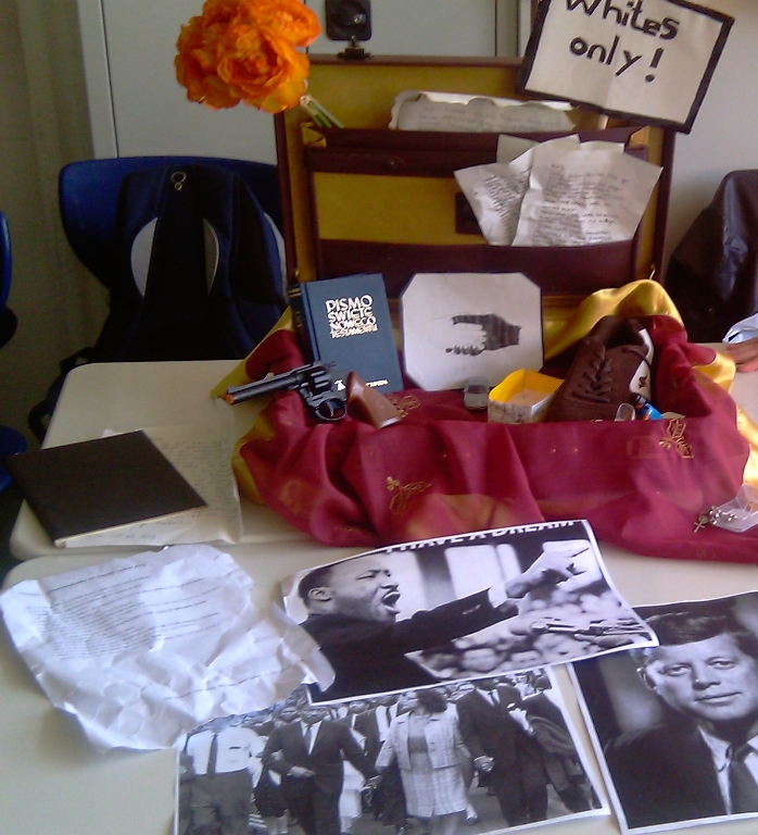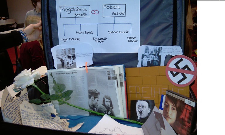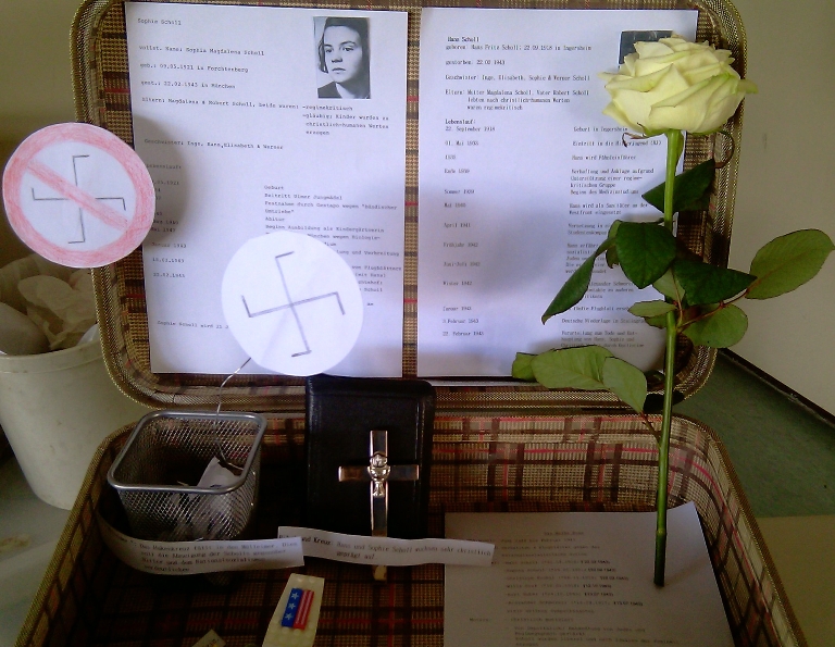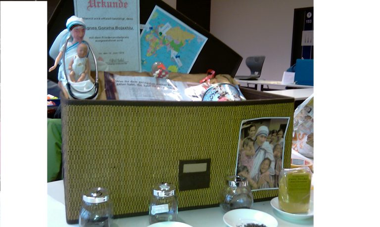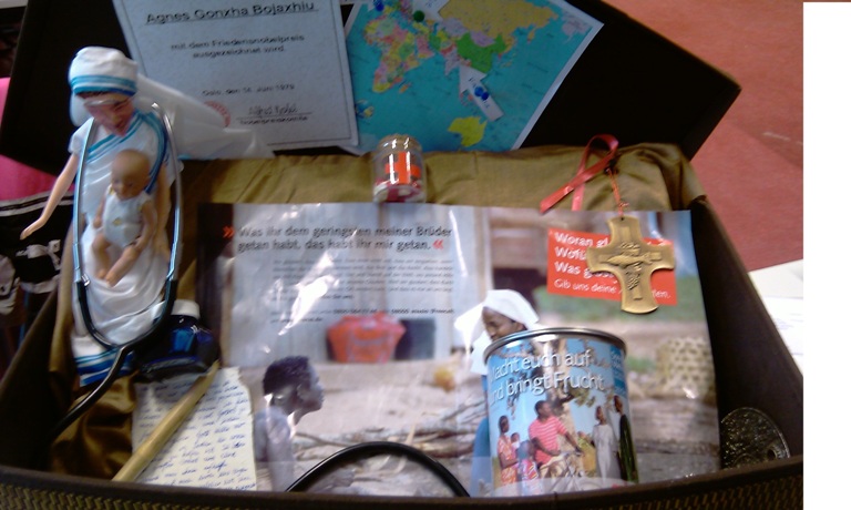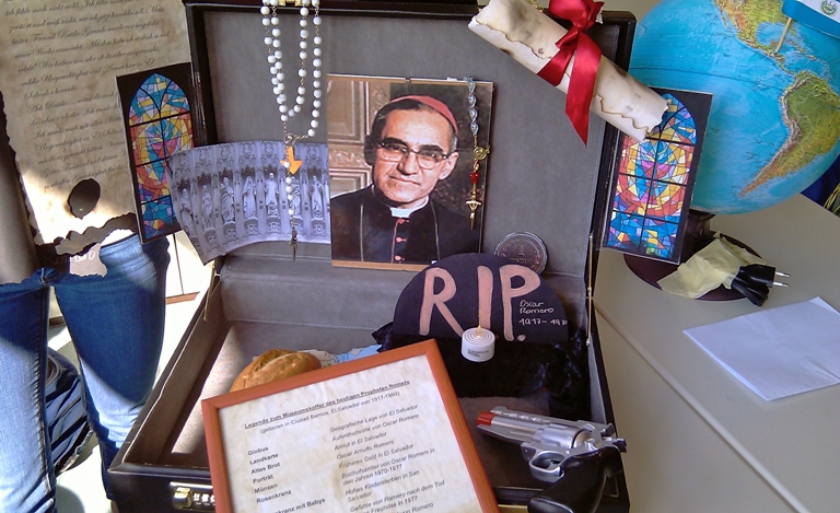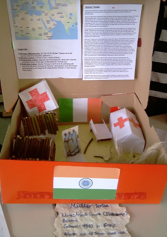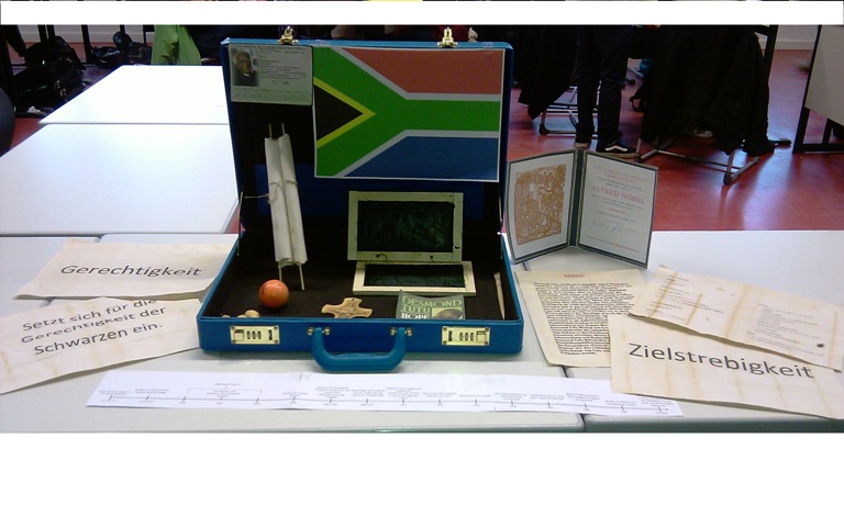 Im Rahmen des katholischen Religionsunterrichts zum Thema „Prophetisch handeln“ haben sich Schülerinnen und Schüler der achten Klassen (Dr. Beate Hämel) im Schuljahr 2011/12 und 2012/13 mit den Biografien „heutiger Propheten“ beschäftigt und eine Ausstellung vorbereitet. Ihre „Museumskoffer“ enthalten neben Lebenslauf und Fotos passende Gegenstände und symbolische Hinweise sowie Briefe und Tagebucheinträge, die von den betreffenden Personen so oder ähnlich hätten geschrieben werden können, um deren Leben möglichst anschaulich zu machen. Nach der Präsentation im Kurs haben auch Schülerinnen und Schüler aus Parallelkursen die Ausstellung mit Interesse angesehen. Die Fotos können einen Eindruck davon vermitteln, wie ideenreich die Koffer bestückt wurden und wie viel persönliches Engagement darin steckt.