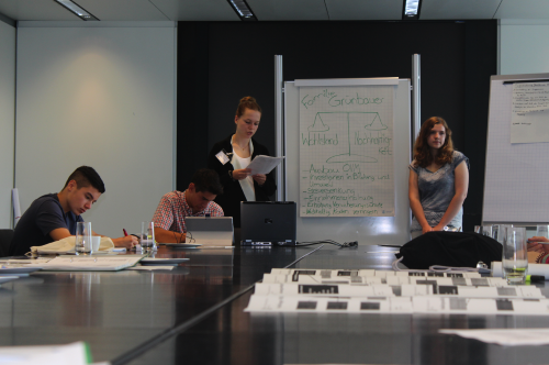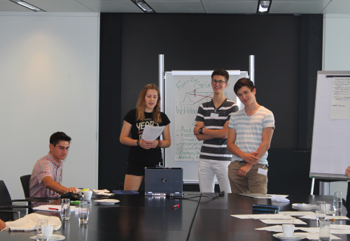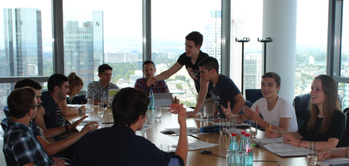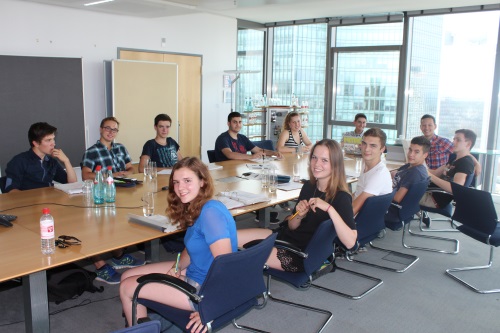 Zwei Tage hatten wir einen Konferenzraum im höchsten Gebäude Frankfurts und dann im Gebäude Galileo, einem weiteren Gebäude der Commerzbank. Als ob ein toll ausgestatteter Raum im Commerzbanktower nicht genug wäre, wurden wir am dritten Tag in das 36. Stockwerk geführt, wo wir einen Konferenzsaal nutzen durften, der nicht nur groß und toll ausgestattet war, wir hatten auch einen unglaublichen Ausblick über die Frankfurter Innenstadt. Man sah den Main, den Römer, und all die Hochhäuser die man sonst auch kennt – nur aus einer anderen Perspektive. Dazu kam, dass uns netterweise von der Commerzbank die Verpflegung zur Verfügung gestellt wurde. Vielen Dank! Es macht schon Spaß, in einem Konferenzraum mit durchgehenden Fensterfronten an drei Seiten, im 36. Stockwerk, einen Kaffee in einer gemütlichen Sitzgruppe zu trinken oder sich mit kleinen Obstsaftfläschchen und belegten Brötchen bei einem Rundblick, angefangen vom Main und weiter bis zum Messeturm, zu stärken. Diese Atmosphäre hat sicher dazu beigetragen, dass alle, trotz nahender Sommerferien, sehr engagiert gearbeitet haben.