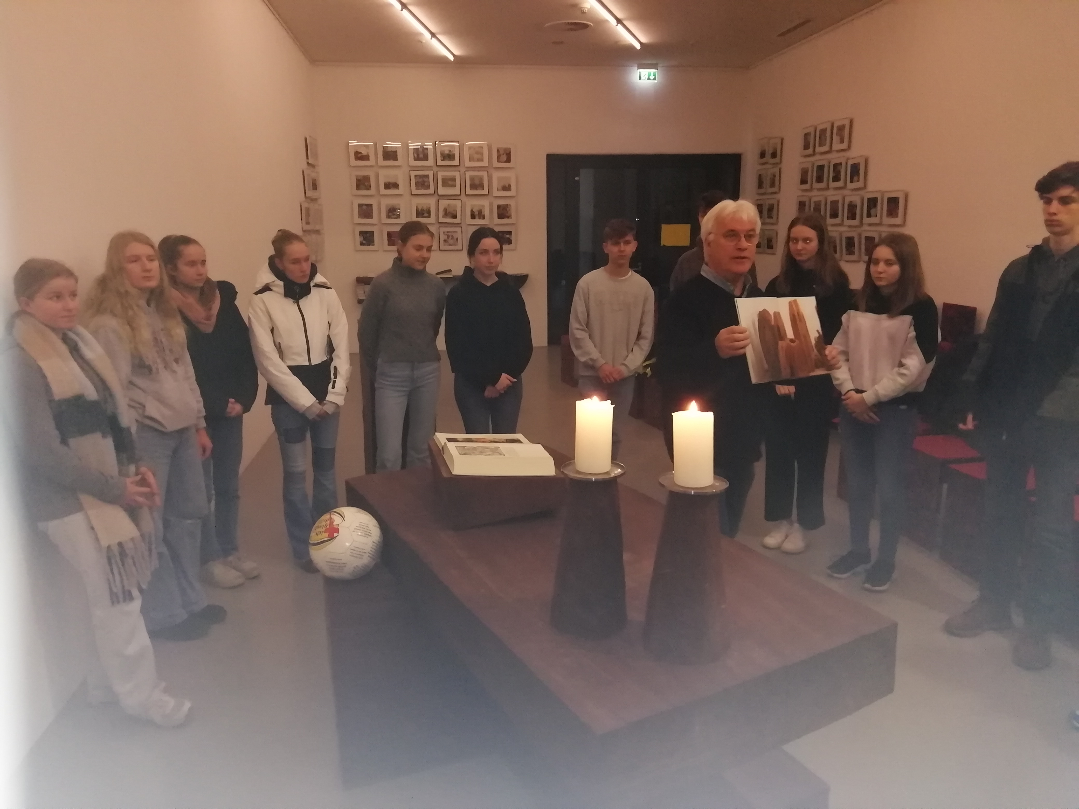 „Mensch, das ist doch der Trapp, da vorne auf dem Fahrrad“. „Tatsächlich, und da kommt Kolo-Muani!“ Intensiver hätte der Beginn der Exkursion des Religionskurses zur Stadionkapelle und zu Stadionpfarrer Eugen Eckert wohl kaum sein können. Vor Weihnachten hatte der Kurs eine Unterrichtseinheit zum Thema „Fußball und Religion“ erarbeitet, und nun wollten sich die Schüler/innen zusammen mit dem Religionslehrer Jochen Kilb von Eugen Eckert schildern lassen, wie eine christliche Kapelle in ein Stadion gelangt und welche Aufgaben ein Stadionpfarrer hat.