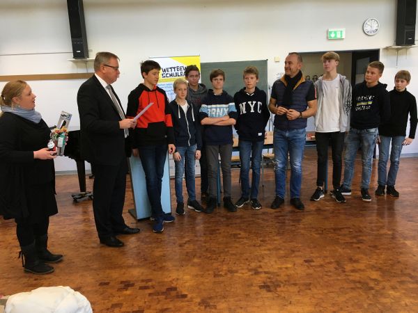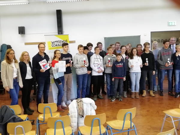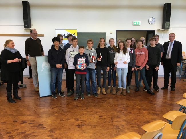 Die Gesamtschule Fischbach, die seit Beginn an dabei ist und jährlich eine prozentual hohe Zahl an Schüler/innen zum Wettbewerb bewegen kann. Die Schülergruppe reiste folgerichtig auch umweltfreundlich mit dem Bus an. (links im Bild Frau Wienen, die für den Ablauf des Wettbewerbs im Landratsamt verantwortlich zeichnet).