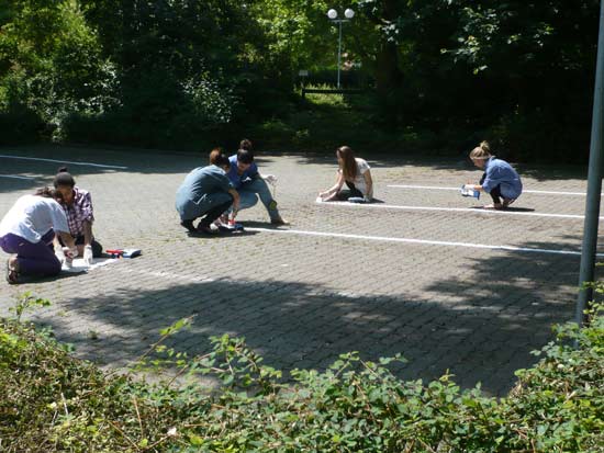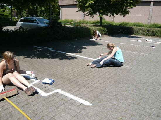 Da es aber dem Leistungskurs zu langweilig gewesen wäre, einfach nur geraden Linien zu ziehen, hatten sie vorher im Unterricht Ideen für kreative Linien entwickelt und Schablonen mit den unterschiedlichsten Motiven angefertigt. So wurde aus einer einfachen Parkplatzbegrenzung schnell eine Fußspur, ein Stromkabel oder man machte gleich einen Knoten hinein.