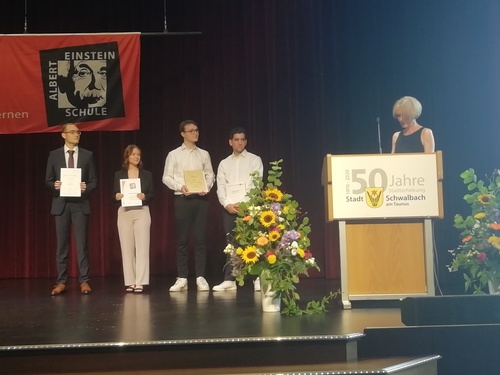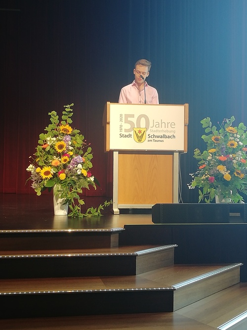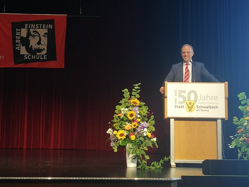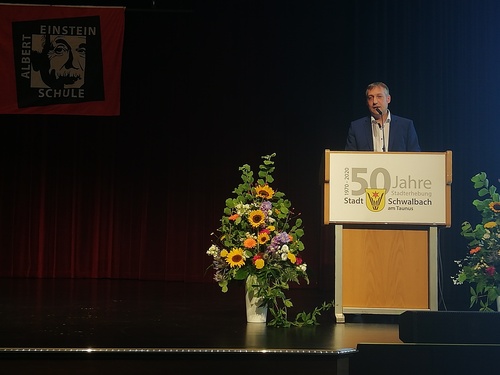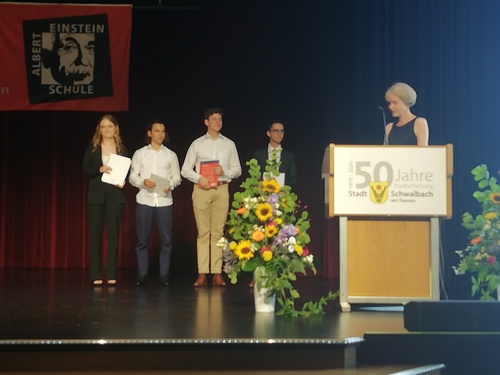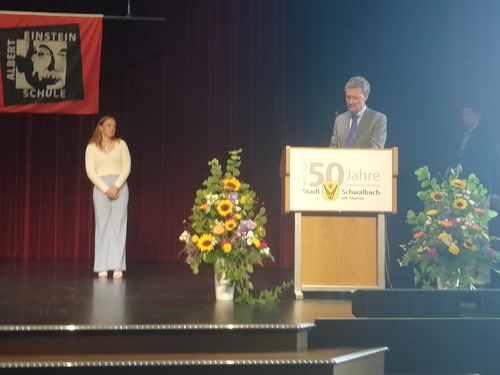 Für die Stadt Schwalbach sprach Bürgermeister Alexander Immisch Grußworte aus. Auch er betonte, sogar vor fast 30 Jahren an der AES sein Abitur abgelegt zu haben. Er lobte das große soziale Engagement der Schülerschaft der AES und nannte dafür Beispiele, die ihn beeindruckt hätten: den demnächst stattfindenden Sponsorenlauf, dessen Einnahmen zur Hälfte dem Klimaschutz zugute kommen, die Hilfe von AES-Schüler/innen für ukrainische Flüchtlinge, die Teilnahme am CO2-Schulprojekt "Following the sun", die große Zahl erfahrener Kilometer beim Klima-Wettbewerb Schulradeln oder auch die langjährige Teilnahme am übergreifenden Arbeitskreis "Kindheit und Jugend im Nationalsozialismus". Mit dem Verweis auf die AES-Abiturienten Roland Koch und Nancy Faeser schloss er: "Die Welt steht Ihnen offen, Sie können noch viel erreichen!"
