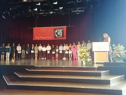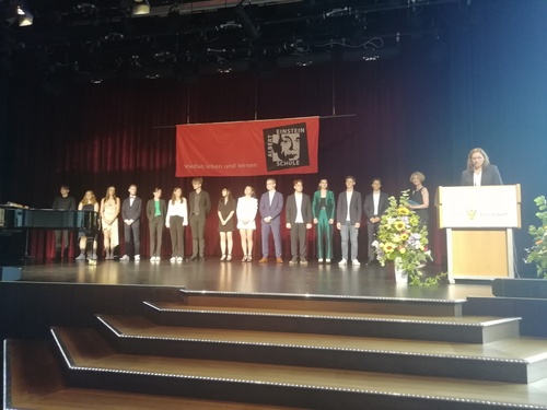 Für die Schüler/innen hielt Alice Noeltgen die Abschiedsrede. Sie rief ihren Mit-Abiturient/innen zu: "Wir gehen nun unterschiedliche Wege, werden dabei Entscheidungen treffen, bisweilen auch falsche. Was uns bleiben wird, sind die Erinnerungen an viele nette Menschen, die wir in der Schulzeit kennengelernt haben, und viele schöne Erinnerungen. Ab jetzt beginnt eine neue Etappe mit 1000 Fragen, aber dank der Flexibilität, die wir zuletzt immer wieder unter Beweis stellen mussten, fühlen wir uns gewappnet."