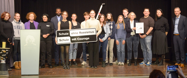 Zum Höhepunkt der Festveranstaltung kam es, als die Landeskoordinatorin "Schule ohne Rassismus", Sabrina Becker, schließlich die Urkunde und ein großes Schild überreichte.