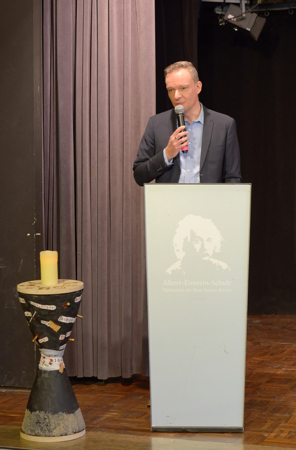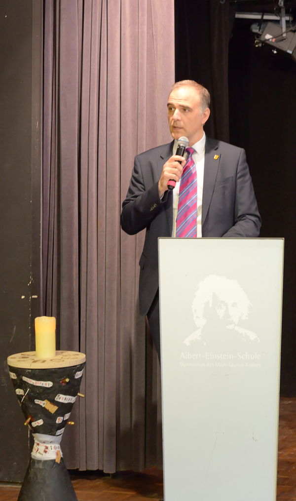 Unter den zahlreichen Ehrengästen, die der Stellvertretende Schulleiter Markus Holz begrüßen durfte, waren neben der Landeskoordinatorin "Schule ohne Rassismus", Frau Sabrina Becker, u. a. die Bürgermeister von Schwalbach und Bad Soden, Alexander Immisch und Dr. Frank Blasch, Schwalbachs Stadtverordnetenvorsteher und Mitglied im Vorstand der Gesellschaft für Christlich-Jüdische Zusammenarbeit (CJZ) Main-Taunus-Kreis, Günter Pabst sowie Leitender Schulamtsdirektor Tobias Deitrich vom Staatlichen Schulamt Rüsselsheim.