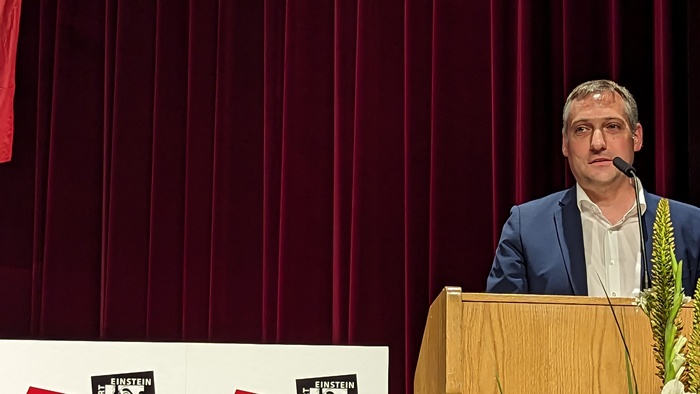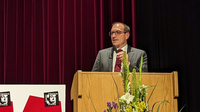 Die Grußworte kamen von Bad Sodens Bürgermeister Dr. Frank Blasch. Er berichtete, dass er nach seinem Abitur ebenfalls vor der Frage gestanden habe: "Und was kommt jetzt?" Diese Zeit könne eine Zeit der Wechselbäder der Gefühle sein. Er riet den Abiturient/innen aber zur Zuversicht, denn erstens hätten sie eine tolle Schulbildung als Basis, zweitens stehe ihnen der wirtschaftlich pulsierende "Heimathafen MTK" immer offen und drittens brauche die Gesellschaft mehr denn je "junge engagierte Menschen wie Sie."