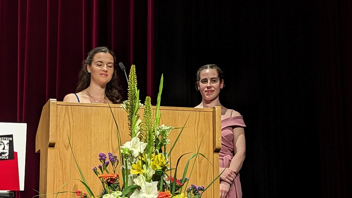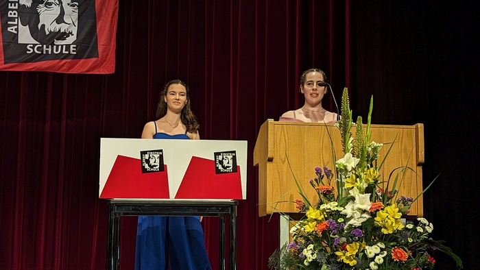 Die Schülerinnen-Rede hielten in diesem Jahr die beiden Stufensprecherinnen Kim Balharek (rechts) und Claire Henning. Sie dankten ausdrücklich allen Freunden und Familienangehörigen, deren Mituntertützung am Erwerb des Abitur nicht hoch genug eingeschätzt werden könne. "Findet eure Stärken und nutzt sie auf eurem Lebensweg", riefen sie ihren Mitschüler/innen zu. Sie konstatierten schließlich: "Wir sind gut für unsere Zukunft gewappnet".