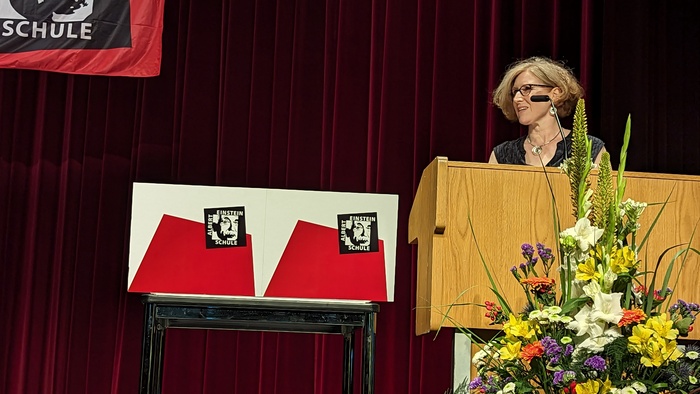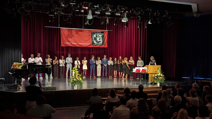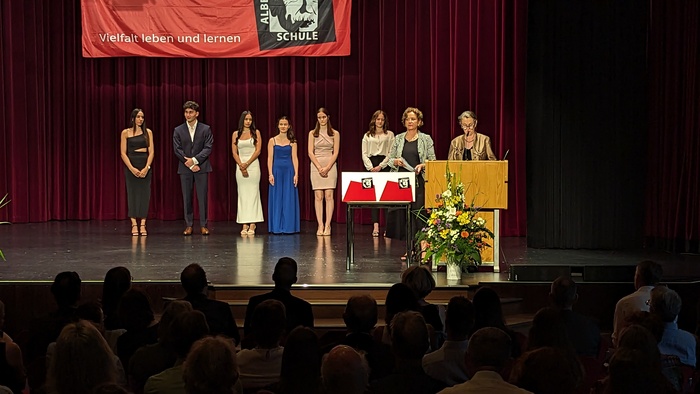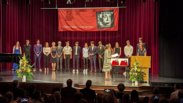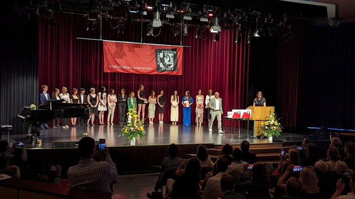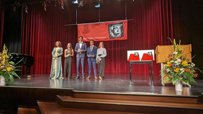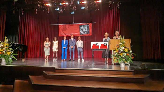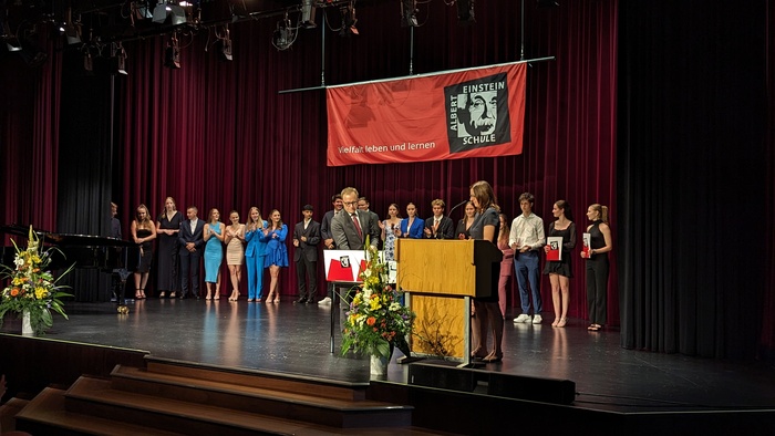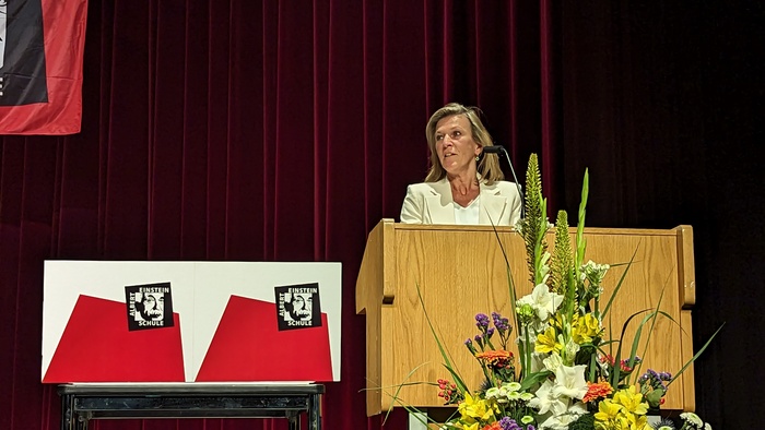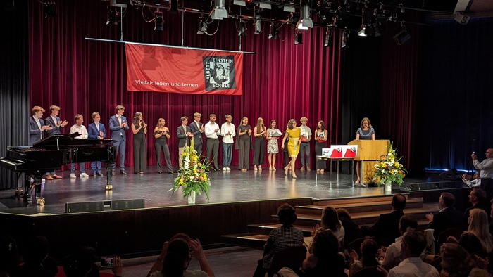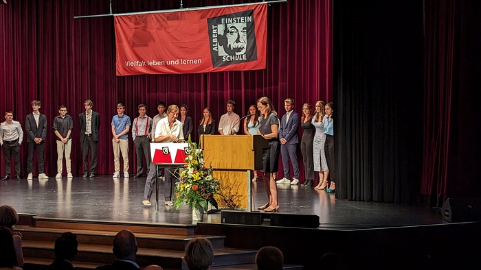 Einen besonderen Dank sprach sie auch den Eltern aus für die konstruktive und vertrauensvolle Zusammenarbeit. Den Abiturient/innen rief sie zu: "Seien Sie bereit, Verantwortung zu übernehmen!" Mit Bezug auf das Motto des Jahrgangs ("Abi Einstein - Intelligenz ist relativ") sprach sie an, dass die Abiturient/innen für die nun kommenden zu bewältigenden Aufgaben soziale Intelligenz benötigen würden. Sie schloss mit einem Zitat Einsteins: "In der Welt, in der du alles sein kannst, sei du selbst!".
