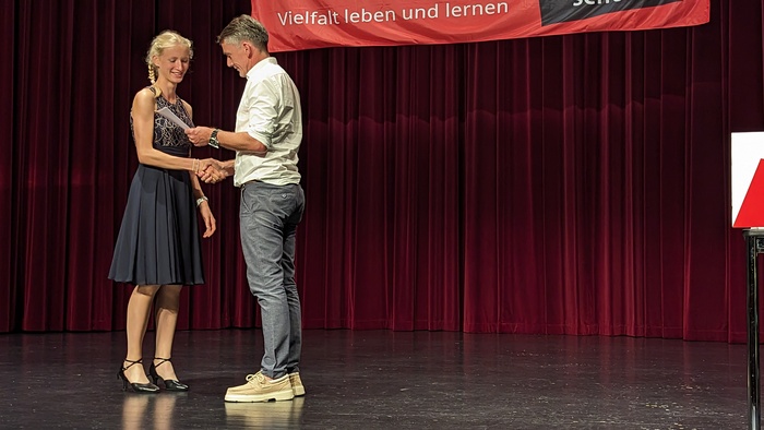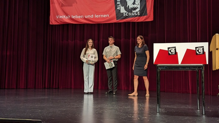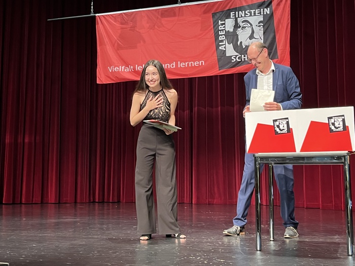 Auch der Preis "Einstein Sozial" für besonderes soziales und gesellschaftliches Engagement in und außerhalb der AES wird nicht in jedem Jahr vergeben. 2023 erhielten ihn Clara Janssen und Per Meyners aus den Händen von Schulleiterin Anke Horn.