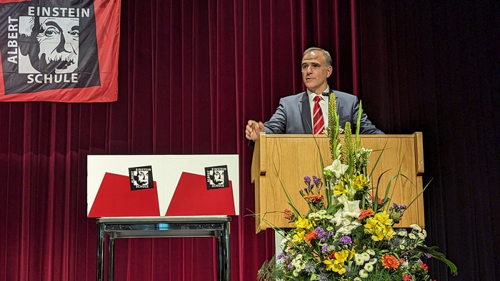 Schwalbachs Bürgermeist Alexander Immisch grüßte "aus meinem Schwalbacher Wohnzimmer Bürgerhaus". Auch er verwies auf sein eigenes Abitur an der AES im Jahre 1993, das seinerzeit noch in der Aula und mit anschließender Party in der AES gefeiert worden sei. Er riet dazu, diesen neuen Lebensabschnitt des Übergangs zu genießen. Das Rüstzeug hätten die Abgänger/innen erworben an einer Schule, an der Vielfalt gewertschätzt werde, die "Schule ohne Rassismus" sei, an der sich viele Schüler/innen aktiv an bürgerlichen Aktivitäten beteiligten, wie z. B. dem Stadtradeln zur Vermeidung von CO2 oder dem "Sauberhaften Schulweg" zur Beseitigung von Müll und an einer Schule, die sich aktiv am Gedenken gegen die Verbrechen des NS beteilige, indem sich Lehrer/innen seit Jahren im "Arbeitskreis Kindheit und Jugend im Nationalsozialismus" engagierten.