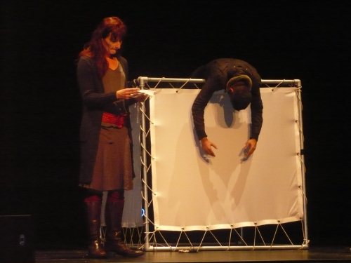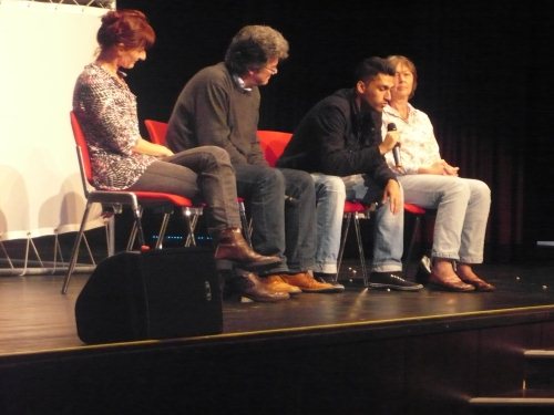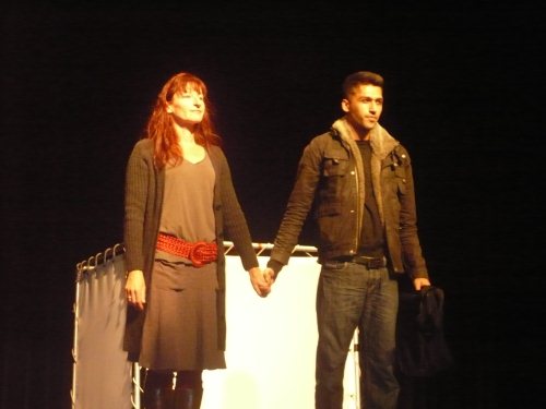 In der Fragerunde, die durch Antonio Umberto Ricco und damit den Autoren des Theaterstücks, moderiert wurde, gesellte sich noch Doris Gießen zu den beiden Schauspielern, die in Frankfurt bei der AWO-Kinder- und Jugendhilfe arbeitet und sich seit Jahren um jugendliche Flüchtlinge in Frankfurt kümmert. Gefragt zur Flüchtlingspolitik der Europäischen Union antwortete sie: „Die Flucht der Menschen müsste in Europa zu Ende sein, oft beginnt sie aber hier erst. Es ist unerträglich, was Europa mit diesen Flüchtlingskindern macht.“