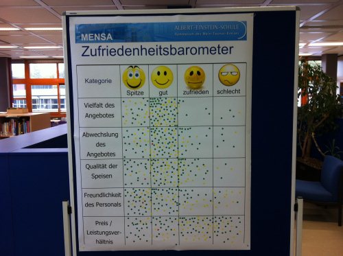Also ist die Frage auch bei uns an der AES, wie man Essen und Trinken aus den Händen des Schulcaterers attraktiv machen kann. Hierzu durften sich die Schüler in einer Kurzbefragung mit dem dargestellten Zufriedenheitsbarometer äußern. Mit einer Punktabfrage jeweils für Mensa und Cafta (Cafeteria) getrennt, konnten die Schüler ihr Votum zur Vielfalt und zur Abwechslung des Angebotes, zur Qualität der Speisen, zur Freundlichkeit des Personals sowie zum Preis-Leistungsangebot abgeben.