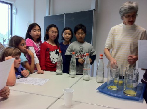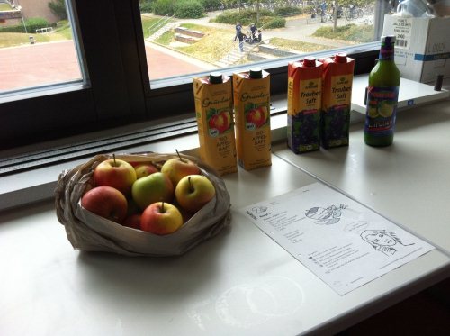 Unter Leitung von Frau Dr. Ulrike Kreinhoff fanden am Tag der Schulverpflegung zwei Unterrichtseinheiten zum „Trinken im Schulalltag“ statt. Der Kunstkurs von Herrn Dr. Möllenkamp, Klasse 8 A, und die Hausaufgaben-AG der Naschu widmeten sich dem Themenkomplex. In drei Schritten konnten die Schüler alles rund um das Thema „Getränke in der Schule“ erfahren: 1. Warum ist Trinken so wichtig? 2. Die Qual der Wahl - Was eignet sich zum Trinken? und 3. „Trinkfit – mach mit!“ – eigene leckere Getränke herstellen, die nicht nur aus Zucker bestehen.