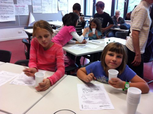 Nach Angaben von Frau Dr. Kreinhoff sollten Jugendliche ca. 1,5 Liter Getränke im Laufe des Tages zu sich nehmen. Bei Sport und Spiel und insbesondere an heißen Tagen erhöht sich der individuelle Flüssigkeitsbedarf. Egal ob Mineralwasser oder Trinkwasser aus der Leitung – Wasser ist der ideale Durstlöscher, vor allem in der Schule. Am Nachmittag darf es dann auch mal etwas geschmacklich anderes sein. Aufpeppen lässt sich Mineralwasser mit etwas Fruchtsaft als Schorle oder mit Früchtetee (mindestens 2/3 Wasser und höchstens 1/3 Saft) und pürierten Himbeeren, Erdbeeren oder anderem frischem Obst sowie einem Spritzer Zitrone. Dies konnten die Jugendlichen selbst ausprobieren, und es machte allen viel Spaß; abschließend zeigte sich in einem kleinem Geschmackswettbewerb der kleinen gebildeten Teams allen (und dies ohne pädagogischen Zeigefinger): Weder die heißgeliebten Limonaden noch unverdünnte Fruchtsäfte eignen sich als Durstlöscher. Der zu hohe Zuckergehalt liefert unnötige Energie und dabei sollen sie doch Konzentrations- und Leistungsfähigkeit gewährleisten.