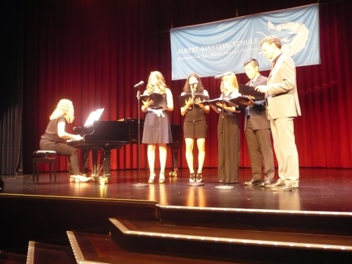 Die musikalische Umrahmung der Verabschiedung erfolgte auf zweierlei Weise: Ein Lehrer-Schüler-Chor mit Anke Wehle-Knoll am Klavier intonierte „Mamma Mia“ von Abba sowie Elton Johns „Can you feel the love tonight“. Es sangen: Sophia von Habsburg, Joanna Olaleye, Luise Schlosser, Henry Gene Go Siong und Matthias Lutz.