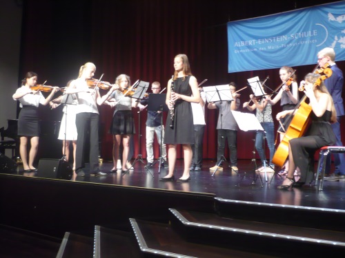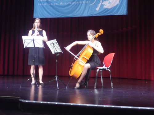 Im zweiten Block eröffnete ein Schüler-Orchester aus Streichern und Bläsern den Abend und es schlossen Nadine Kremer an der Klarinette im Duett mit Annabel Hauk am Cello.