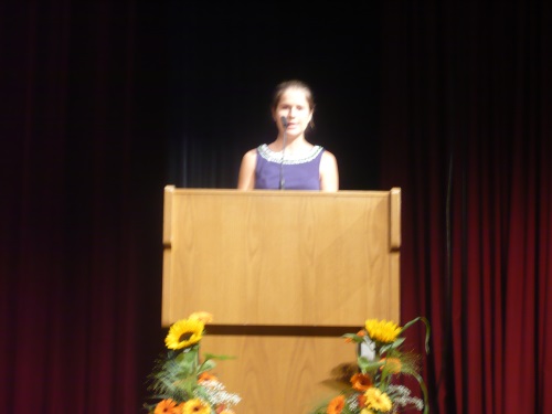 Babette Spano eröffnete dann auch den Ehrungsblock, beginnend mit der Auszeichnung für die vier 1,0-Abiturient/innen: Constantin Brandt, Nicola Grebe, Nadine Kremer und Antonia Thielecke wurden für diese hervorragende Leistung geehrt.