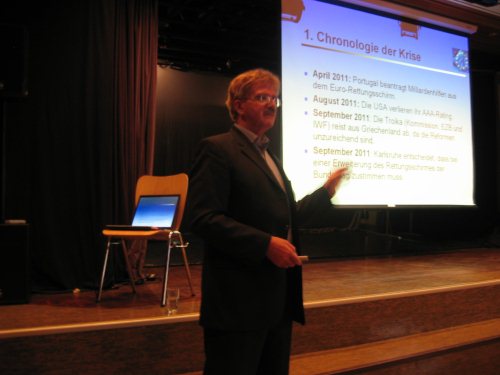 Dabei präsentierte er die Zusammenhänge bereits getroffener Maßnahmen und derzeit diskutierter Vorschläge, ging auf die Ursachen der europäischen Schulden- und weltweiten Finanzkrise ein und äußerte seine Positionen zu aktuell debattierten Konzepten von Finanztransaktionssteuer und Euro-Bonds.