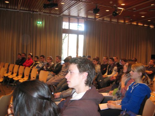Mit großem Engagement beteiligten sich die Schülerinnen und Schüler der Oberstufenkurse, die sich mit der Thematik des Vortrags in den voran gegangenen Wochen eingehend beschäftigt hatten, an der Diskussion. Einige zum Beispiel wollten wissen, wie man der aktuellen Krise entgegenwirken und somit eine neue Krise verhindert werden könne. „Es muss klare Spielregeln für die Finanzmärkte geben und ein Rahmen geschaffen werden, der das Zocken auf Staatskosten unterbindet“, so Mann. Er ging weiter und forderte „klare Regeln für Hedgefonds und eine Risikobeteiligung der Unternehmen“. Zudem zeigte sich der Europa-Abgeordnete als Unterstützer von Schuldengrenze und Finanztransaktionssteuer, wohingegen er der Einführung von Euro-Bonds in der gegenwärtigen besprochenen Form eher ablehnend gegenüber stand.