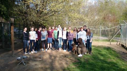 Auf dem Bild ist unser Bio- Kurs zusammen mit der Hündin „Lady“ und einer Tierpflegerin bei dem Besuch im Tierheim zu sehen.