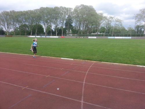 Vincent (8C, in blauem Trikot), der die AES-4x75m-Staffel als Schlussläufer zum Erfolg führte.