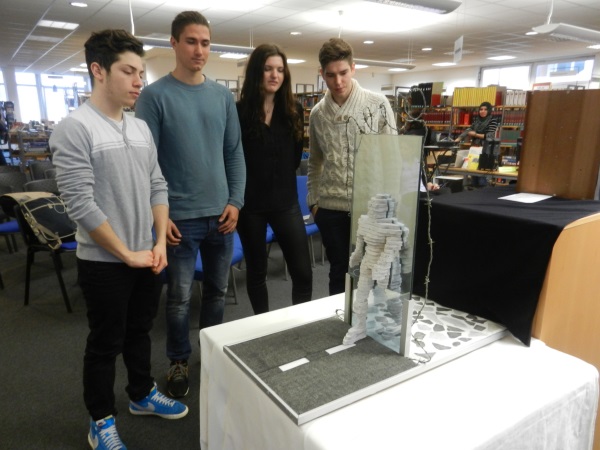 Die Schüler/innen des Kunst-Leistungskurses der Albert-Einstein-Schule (AES) von Frau Katrin Struck setzten sich intensiv mit dem Thema Befreiung, besonders mit der Befreiung des Vernichtungslagers Auschwitz, auseinander und erstellten dabei Schülerprojektarbeiten in Form von Skulpturen.