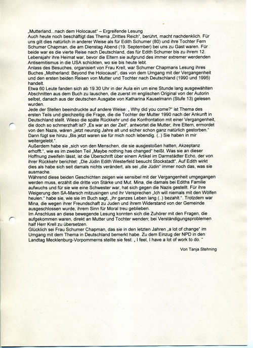 Der Bericht der Schülerin Tanja Stehning über die Lesung aus dem Jahre 2006 ist hier abrufbar. Tanja Stehning legte ihr Abitur an der AES 2007 ab.