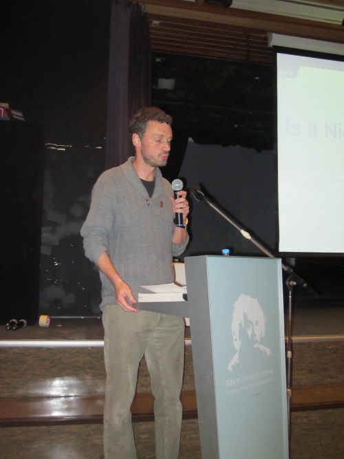 Am 13.11.2014 fand an der AES im Mehrzweckraum von 9.45 Uhr bis 11.20 Uhr eine Autorenlesung in englischer Sprache vor drei Englisch-Leistungskursen der Q1-Phase statt.