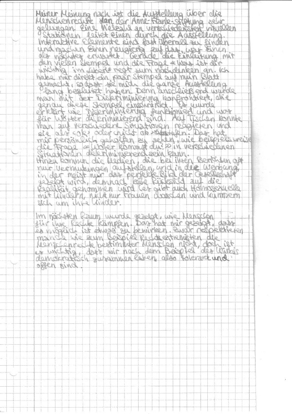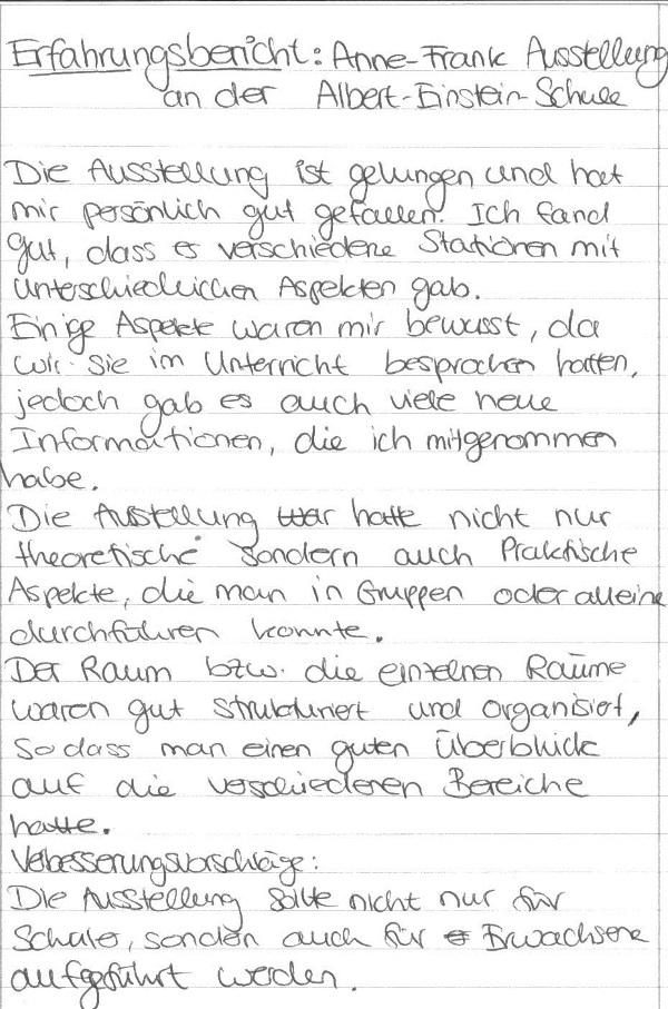 Drei Schüler/innen der E-Phase schrieben einen Erfahrungsbericht nach dem Besuch der Ausstellung mit Ihrer Lehrerin. Die Erfahrungsberichte sehen Sie im Folgenden: