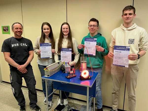 Mit Spaß an physikalischen Knobeleien, guten Mathematikkenntnissen, Freude am Experimentieren und mit kreativen Ideen gelang ihnen das so erfolgreich, dass alle vier auch zur 2. Runde zugelassen waren. Und trotz Erkältungszeit und Klausurenphase traten sie im November gemeinsam mit 437 Teilnehmenden deutschlandweit zur Klausurrunde an. Dabei gab es einen Multiple-Choice-Test zu meistern, bei dem die gewählte Antwort begründet werden musste, gefolgt von einem klassischen Klausurteil.