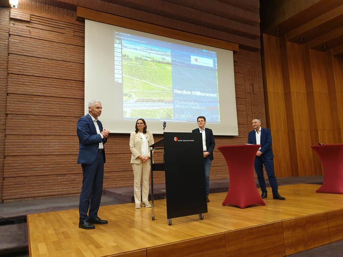 Landrat Michael Cyriax begrüßt Schulleiterin Anke Horn (ganz rechts: Schuldezernent Axel Fink, 2. von rechts: Keynote-Sprecher Matthias Feuerstein)