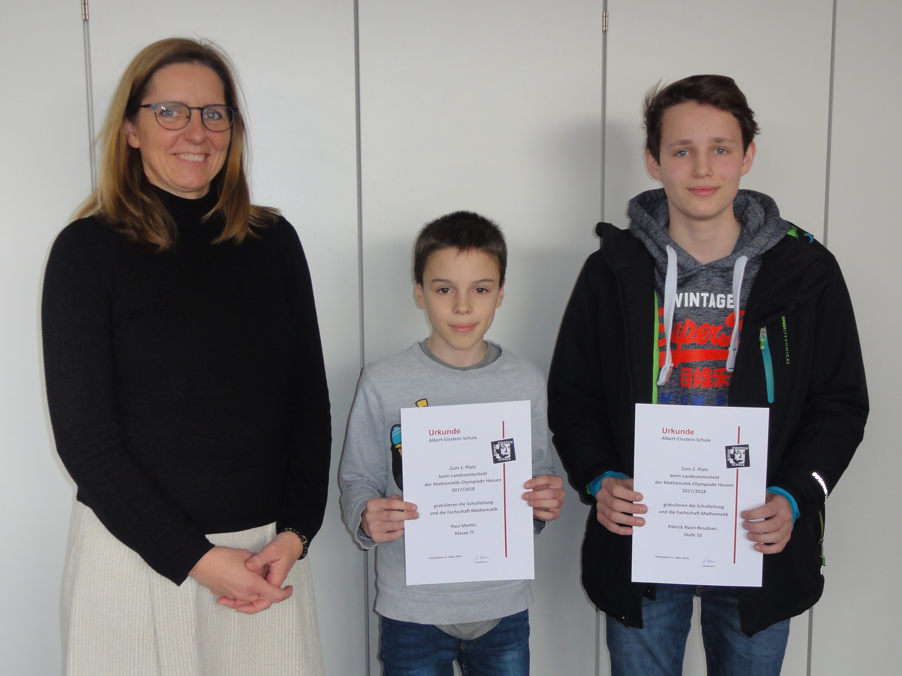 Nachdem in diesem Schuljahr wieder vier erfolgreiche junge Mathematikolympioniken aus der großen Schar mathematikbegeisterter Schülerinnen und Schüler die Albert–Einstein–Schule beim Landeswettbewerb der 58. Mathematikolympiade vertreten durften und mit einer Gold- und einer Silbermedaille zurückkehrten, war die Freude bei den Geehrten natürlich groß.