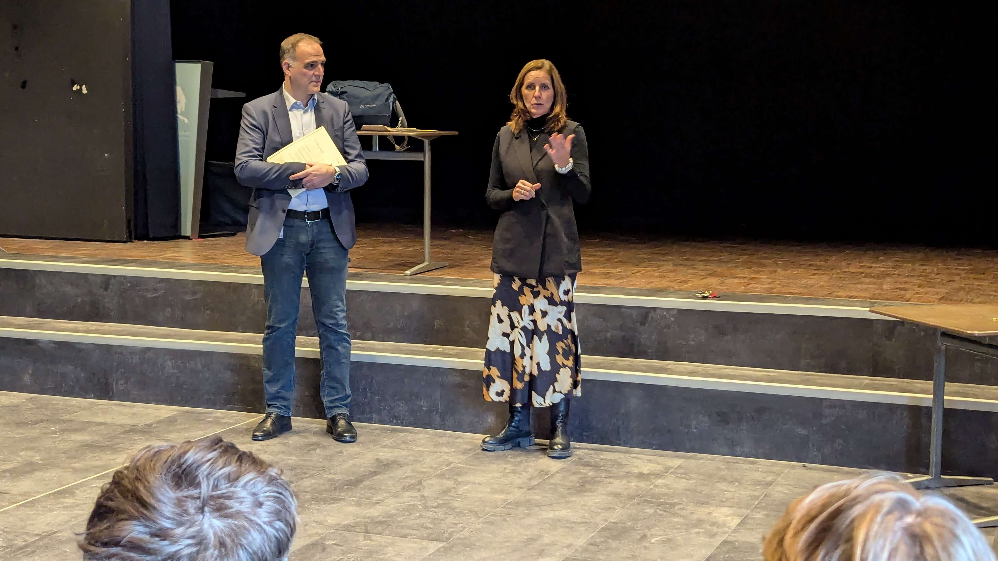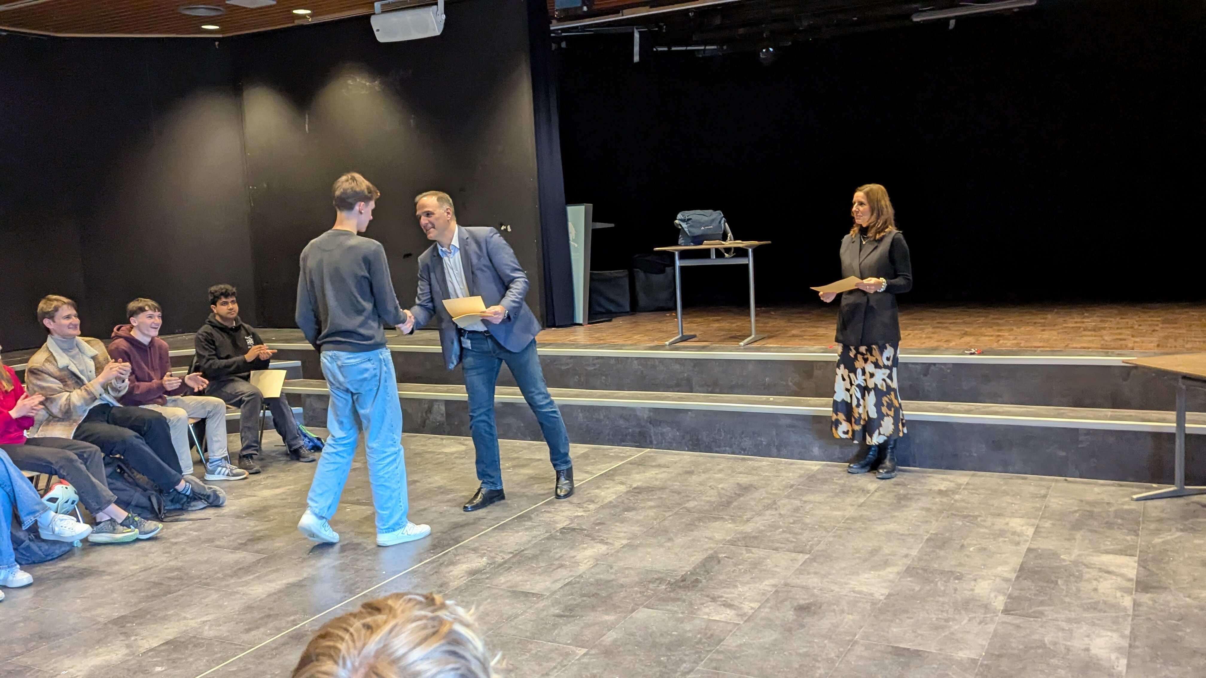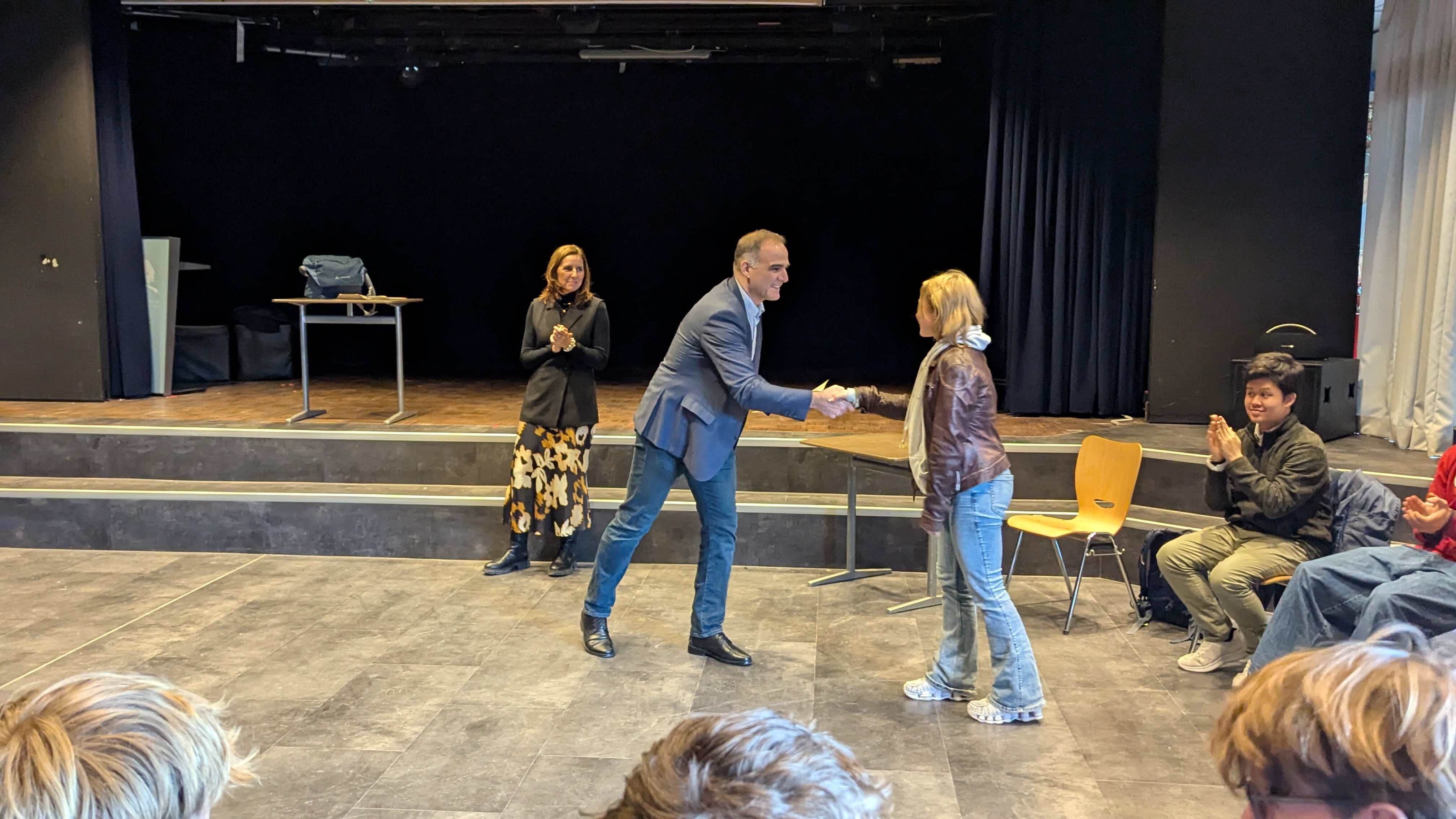 Und so konnten bereits eine knappe Woche nach Ende der Juniorwahl am Freitag, 28. Februar, im Mehrzweckraum der AES 29 Schülerinnen und Schüler, zum überwiegenden Teil aus der E2-Phase, aus den Händen von Alexander Immisch und Schulleiterin Anke Horn ihre Anerkennungsurkunden entgegennehmen.