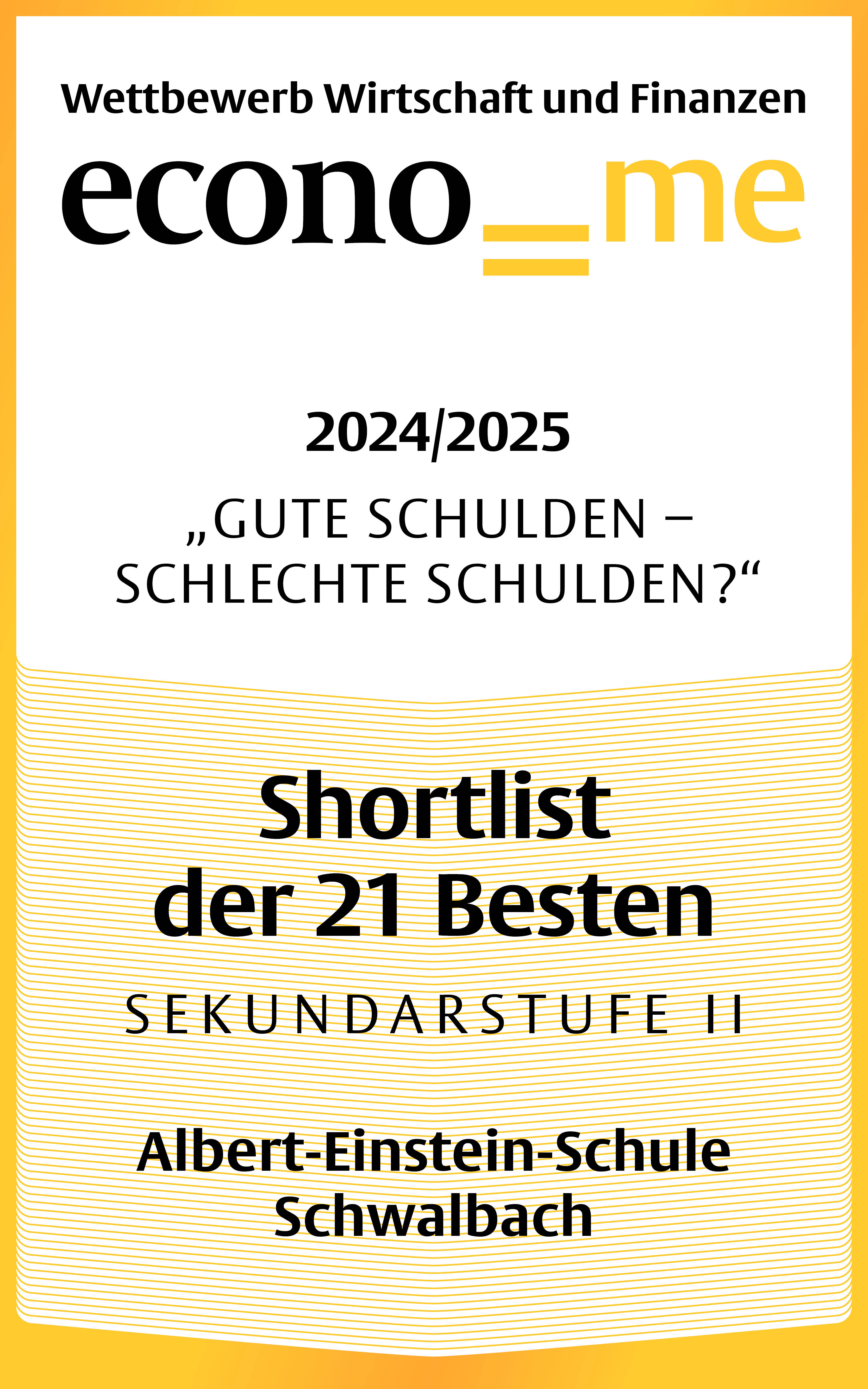 Die AES Schwalbach freut sich über einen besonderen Erfolg im Schuljahr 2024/25: Der WiWi-Leistungskurs von Frau Koch-Holstein hat beim bundesweiten Wettbewerb „Wirtschaft und Finanzen“, ausgerichtet von der Flossbach von Storch - Stiftung, einen Platz auf der begehrten Shortlist der 21 besten Beiträge aller teilnehmenden Schulen der Sekundarstufe II erreicht.