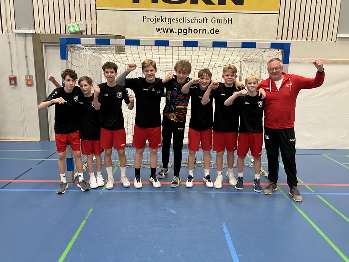 Im erfolgreichen Team spielten für die AES: Lias Gorny (TW), Nicolas Rom, Felix Mildenberger, Jonas Löwe, Moritz Gabriel, Leon Kirchner, Georg Schmidt und Jonathan Fischer. Rechts im Bild: Klaus Kauselmann.