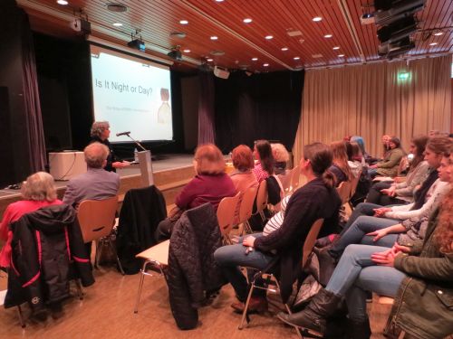 Fern Schumer Chapman beim Vortrag über ihr letztes Buch "Is It Night or Day?"