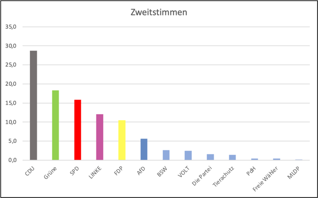 CDU: 28,7% / GRÜNE: 18,2% / SPD: 15,8% / DIE LINKE: 12,0% / FDP: 10,4% / AfD: 5,6% / BSW: 2,6% VOLT: 2,4% / DIE PARTEI: 1,6% / Tierschutzpartei: 1,4% / Freie Wähler: 0,4% / PdH: 0,4% / MLPD: 0,2%